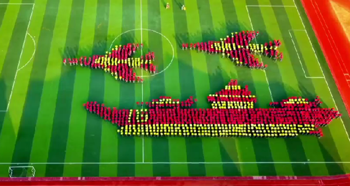 振奋人心的文化方阵汇演掀起了展演的最高潮。“航母”与“战斗机”造型缓缓走向训练场。党的二十大对青年发出号召“怀抱梦想,脚踏实地,敢想敢为,善作善成,有理想,有担当,能吃苦,肯奋斗”的字样以及党徽、校徽等图案一一在方阵中勾勒。主题鲜明的图案、嘹亮的口号、深情的解说,展示了广东工程学子积极向上的精神风貌,表达了他们爱党爱国爱校的深切情感。
