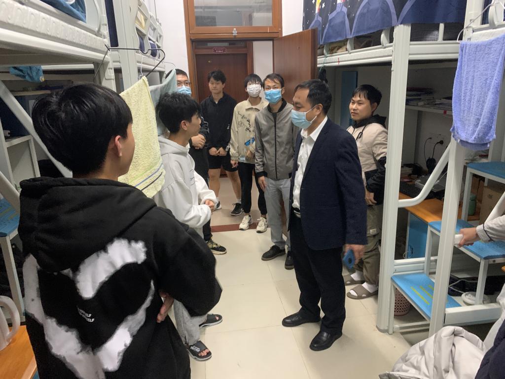 11月30日晚,学校党委书记吴琦琳,党委委员、副校长揭英荣、吴志敏、张小广等校领导带领在学校值守的中层干部、辅导员走访学生宿舍,亲切地与同学们谈心谈话,了解同学们的思想动态,倾听青年心声。