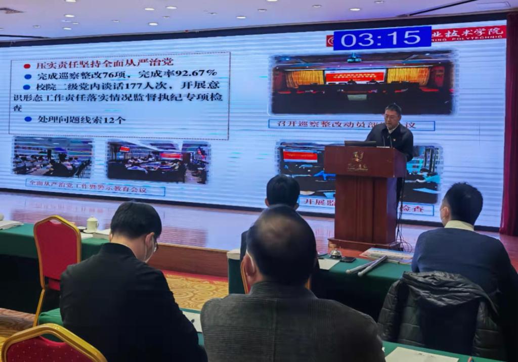 学校党委书记吴琦琳参加述职大会并述职。他在述职中总结,一年来,认真履行抓基层党建责任,落实新时代党的建设总要求,深入学习贯彻习近平新时代中国特色社会主义思想、党的二十大精神,教育引导广大党员干部深刻领悟“两个确立”的决定性意义,不断提高政治判断力、政治领悟力、政治执行力,增强“四个意识”、坚定“四个自信”、做到“两个维护”。落实全面从严治党主体责任,健全“党委委员挂点联系基层党组织制度”,扎实开展巡察整改工作;开展基层党组织标准化建设,提升基层党组织政治功能和组织力,推进党建“双创”和特色化建设,党建工作取得新成效;深入推进“三全育人”体制机制改革试点工作,建设“一院一式”学生社区,打造“三位一体”征兵体系,思政育人展现新亮点;强化党建引领提升学校基层治理效能,发挥党员干部在疫情防控中先锋表率作用,抓好疫情防控,写好“建新校、抓扩容、重管理”办学发展奋进之笔,学校立项成为省域高水平高职院校建设单位。同时,也存在加强思想建设不够扎实、全面从严治党工作机制和压力传导机制还不够完善、党建品牌项目亮点还要深化、推进党风廉政建设力度有待进一步增强等不足。