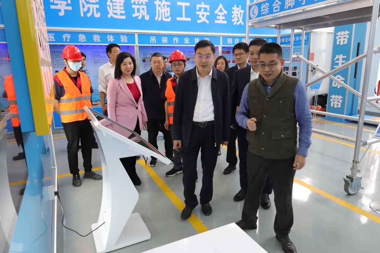 程大欣一行先后到长隆产业学院、迅达电梯产业学院、建筑施工工场与建筑施工安全教育体验馆等实训场地考察调研,重点了解了学校实训室建设、校企合作、产教融合等工作。