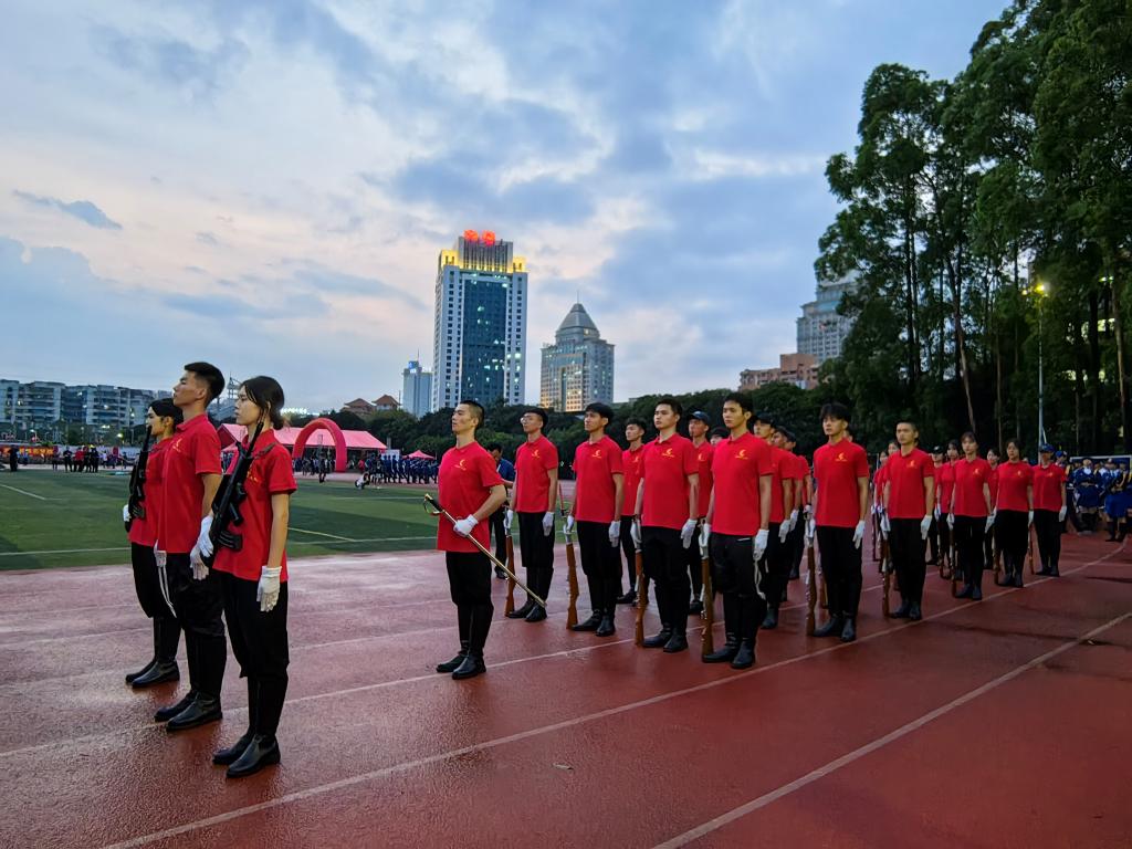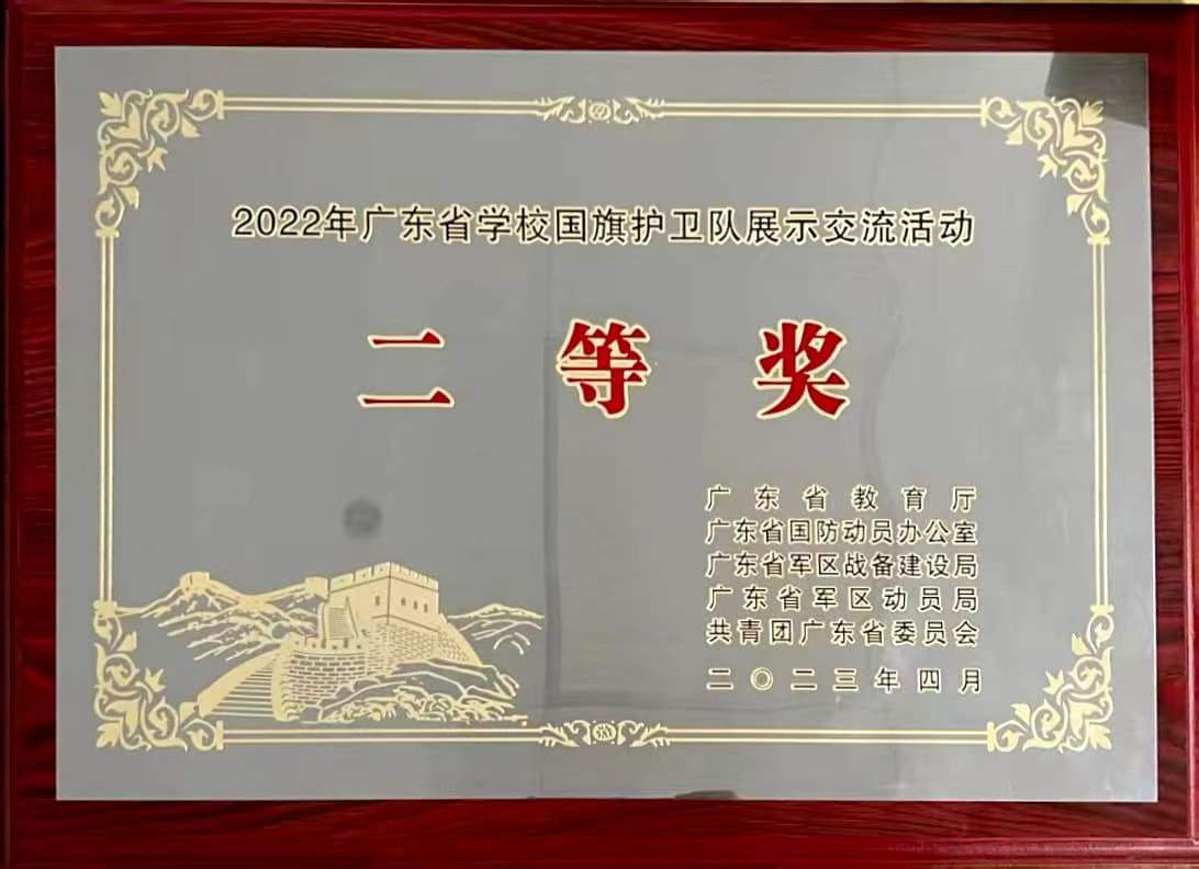 2023年4月25日,我校国旗护卫队到五邑大学参加2022年广东省学校国旗护卫队展示交流活动高职组决赛。在本次展示活动中,与来自省内41所高职院校的国旗护卫队同台竞技,全体队员在赛场上精神抖擞、士气高昂,顺利完成了展示。经过激烈角逐,最终凭借标准的队列动作、规范的队列标准和良好的精神风貌,最终荣获团体总分二等奖,升旗、护旗、指挥和队列展示单项一等奖一个、二等奖两个、三等奖一个的优异成绩。