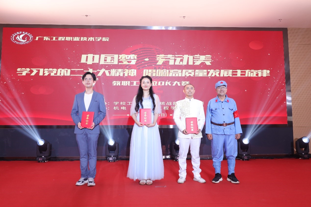 公共服务学院张霞老师演唱的《山不转水转》、人工智能学院赖佳龙老师演唱的《爱拼才会赢》、财经学院王胜利、林密蒲、曹阳城、李翔老师演唱的《我的中国心》、机电工程学院刘莉、莫家俊、王诺老师演唱的《绒花》、马克思主义学院张嘉伟老师演唱的《中国人》获得三等奖。