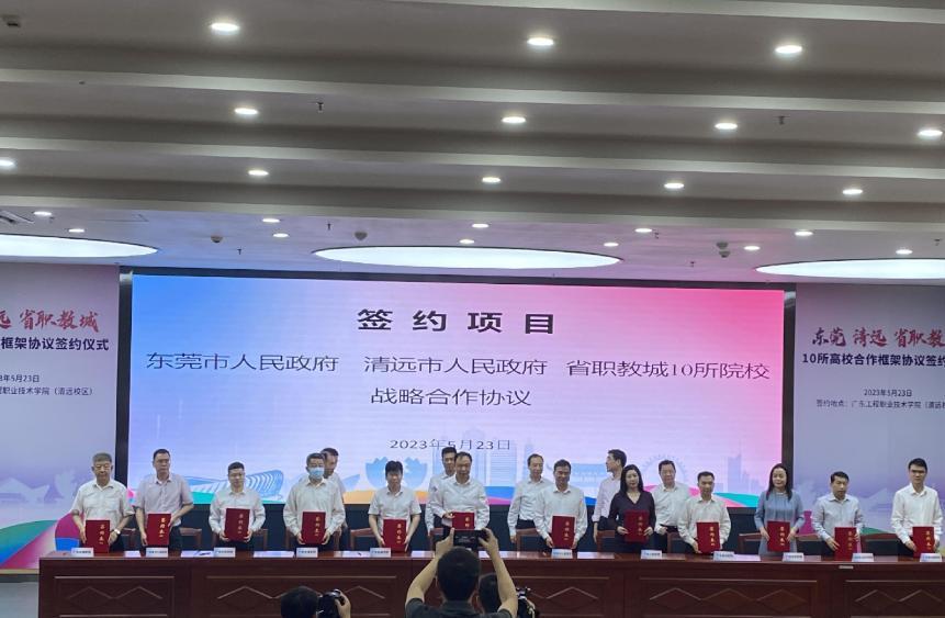 5月23日,东莞、清远、省职教城10所高校合作框架协议签约仪式、东莞第十四届校企洽谈会(清远分会场)暨联合招聘会在我校省职教城校区举行。深入学习贯彻党的二十大精神,认真贯彻落实习近平总书记视察广东重要讲话、重要指示精神,共建技能人才协同培养平台,促进大学生就业工作。东莞市委副书记、市长吕成蹊,清远市委副书记、市长温文星出席签约仪式并讲话,我校校长李丽参加活动并签约。东莞市政府、清远市政府与省职教城10所高校签订了合作框架协议。