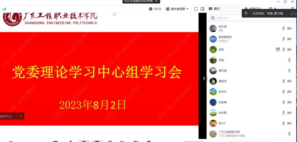 8月2日,学校党委理论学习中心组举行学习会,深入学习习近平总书记在文化传承发展座谈会上重要讲话精神。学校党委副书记、校长李丽主持会议并进行了领学,全体党委委员参加了学习会,纪检室、党政办公室、宣传部(武装部)负责人列席了会议。