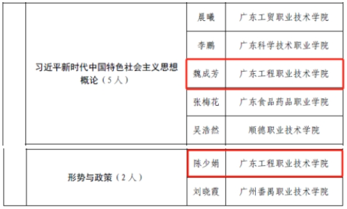 第三届全国高校思想政治理论课教学展示活动思政课教学竞赛我校2名教师获广东省教育厅推荐名额,该展示活动获奖教师同时获得全国职业院校技能大赛思想政治教育课教学能力比赛证书。