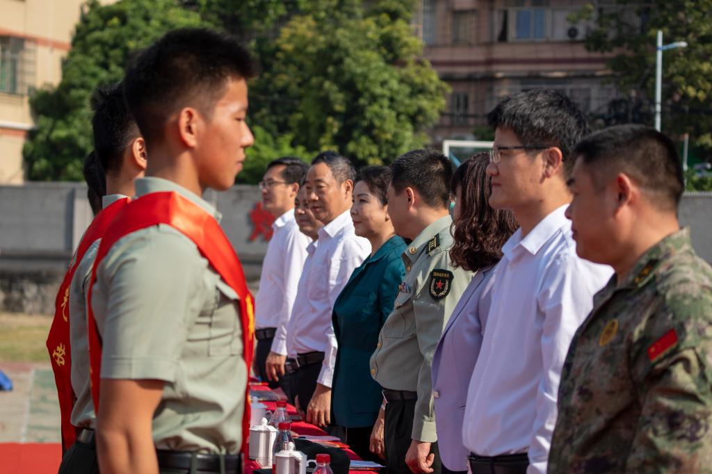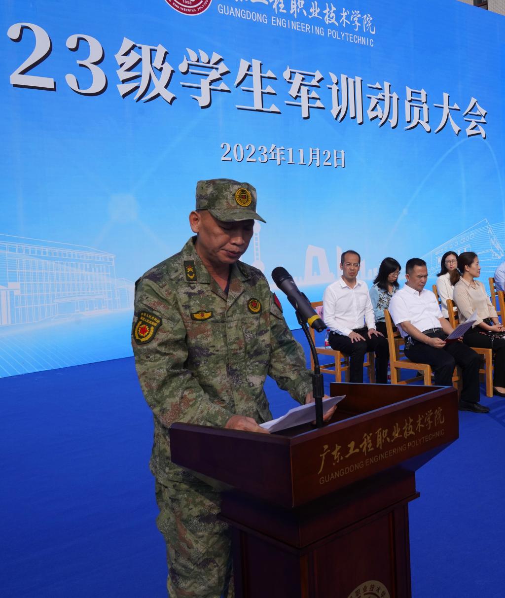 南沙区武装部颜俊政委、榄核镇武装部陈广清部长代表教官发言,承诺严格要求,按纲施训,确保高质量完成军训任务。希望参训学生服从命令,听从指挥,团结同学,严守纪律,吃苦耐劳,勤学苦练,铸就青春向党的赤子之心,展现令行禁止的军人气魄,养成使命必达的军人作风。