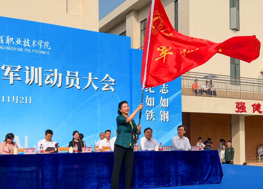 沙场秋点兵。校长李丽向两校区军训团教官代表张定根、陈广清团长授军训团团旗。红旗如火,挥舞的旗帜点燃了青春的热烈和军训的激情。