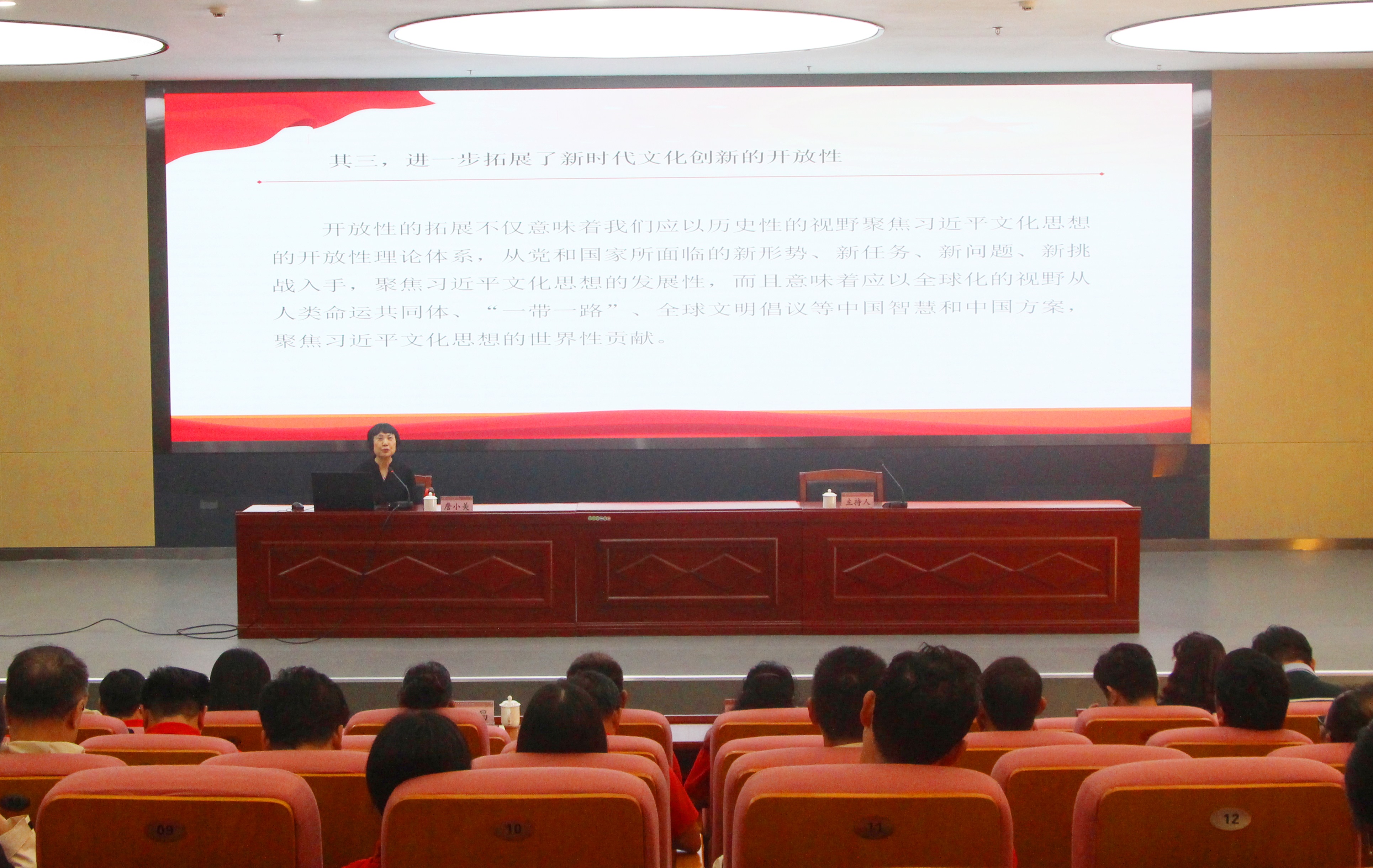 詹小美教授以《深入学习贯彻习近平文化思想》为主题,从“习近平文化思想的时代意蕴”“习近平文化思想的发展脉络”“习近平文化思想的理论逻辑”“习近平文化思想的主要内涵”和“以习近平文化思想为遵循担负起新的文化使命”五个方面对习近平文化思想进行了系统解读和深入阐释。报告主题鲜明、立意高远、观点深邃、逻辑严谨、内容丰富,既有理论高度和思想厚度,又有很强的实践指导性,为全体党员干部进一步学习贯彻习近平文化思想,进一步坚定文化自信,明确宣传思想工作者的使命担当,深刻领悟建设中华民族现代文明的历史重任起到了很好的推动作用。