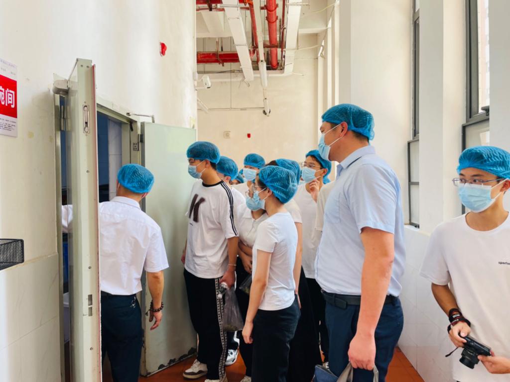 座谈会结束后,总务后勤部(保卫部)老师带领同学们参观体验了各食堂关于进菜、验收、粗加工、各类菜品分区切配等环节。通过近距离的观察,让同学们了解食堂的生产操作流程,体验到食堂工作的严谨和辛苦,切身感受到学校对食堂工作的重视和保障,更加崇尚劳动、尊重劳动、热爱劳动。