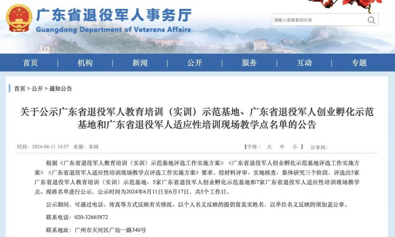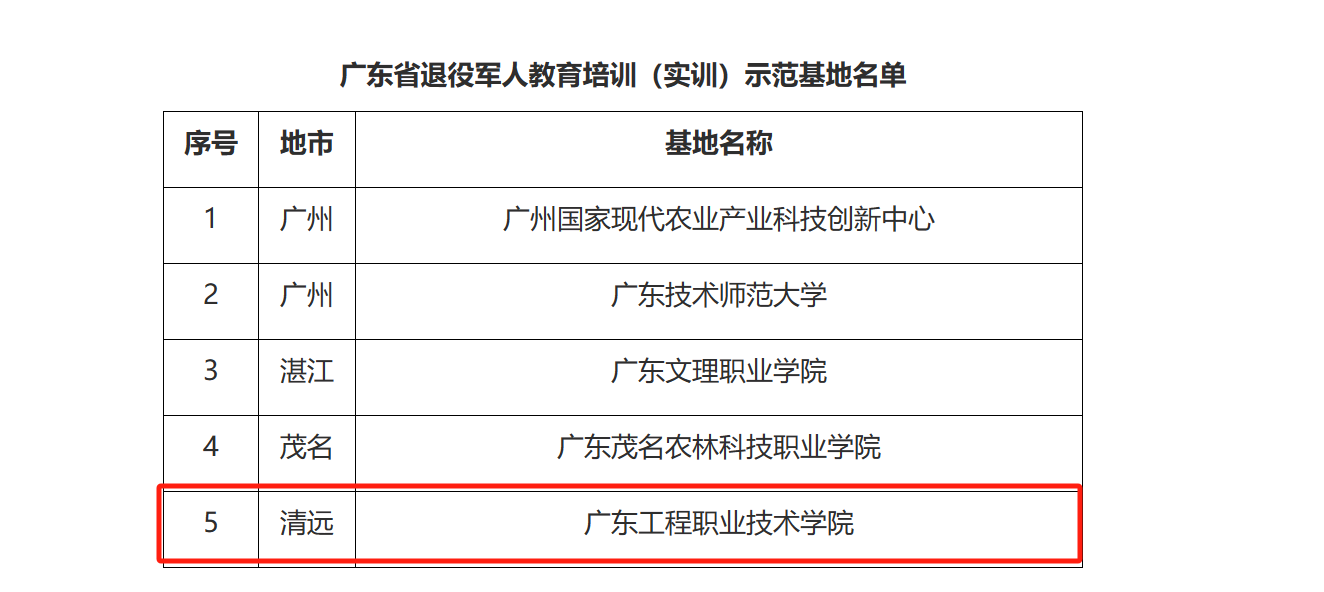 根据广东省退役军人教育培训(实训)示范基地认定工作安排,我校经清远市退役军人事务局报送,通过自主申报、地市推荐、审查评估、专家评审、社会公示等环节,被认定为广东省退役军人教育培训(实训)示范基地,此次共认定5家广东省退役军人教育培训(实训)示范基地,我校为粤北地区唯一一家。