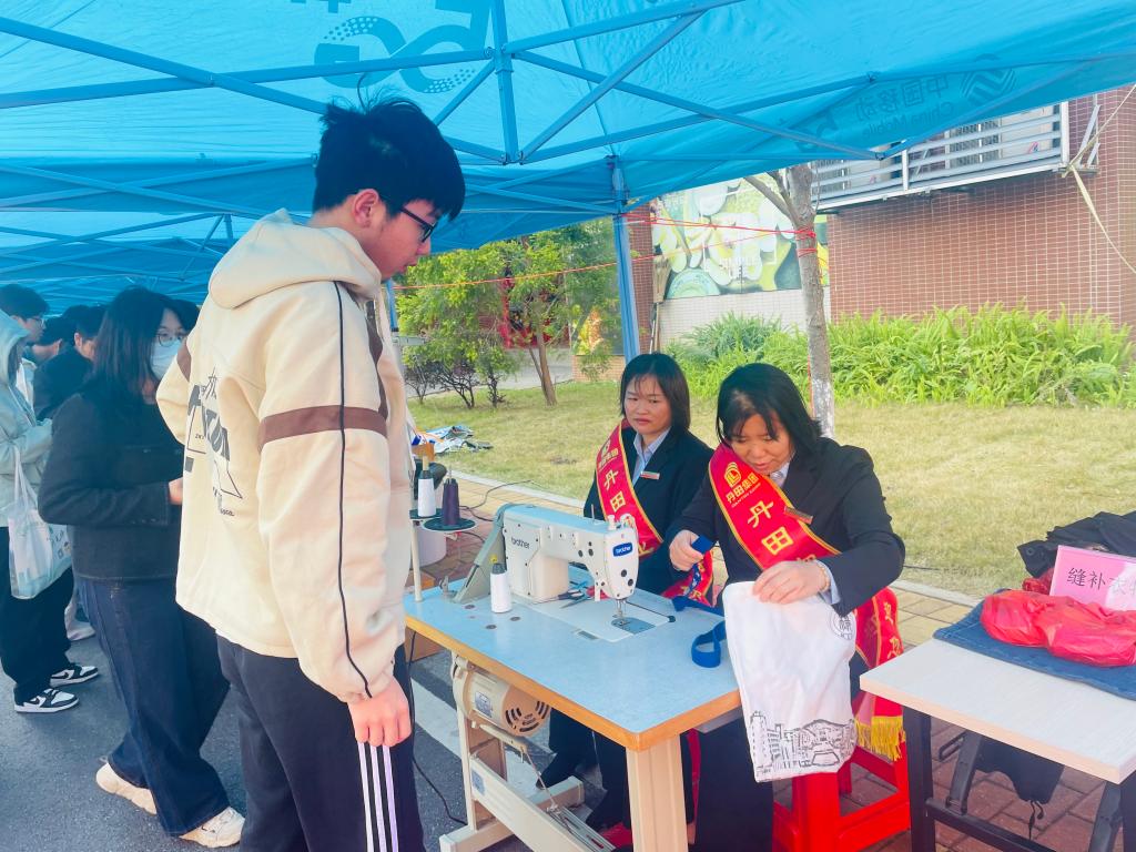 两校区活动现场均含有服务区、宣传区、体验区、咨询区等四维一体的综合“服务集市”,其中中医理疗、缝补衣物、义务维修、单车打气、超声波清洗眼镜等服务模块深受同学们的喜爱;食堂推出的特色小吃、水果、糕点任意品尝,派发奶茶、蛋挞、麻薯兑换券等更是热闹火爆;还有街道、派出所有血液机构人员前来我校做垃圾分类、消防、禁毒、反诈、献血等宣传活动,活动现场热闹非凡。既让师生直观感受后勤服务的温度,也收集了师生对后勤服务的满意度,“很开心,阿姨帮我缝补了包包、扣子、破洞衣服,手艺很好!”、“眼镜清洗的非常干净,瞬间眼前一亮!”、“太好了,我的小书柜修好了!”、“物业维修比较及时,师傅很热情”、“宿管阿姨服务态度热情!”、“我的肩颈痛,医生帮我理疗后,现在舒服多了”、“体验了心肺复苏操作,我涨知识了”……同学们纷纷留言。