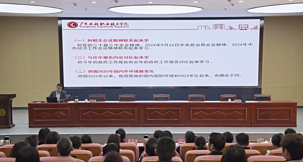学习会邀请了全国人大代表、广东鼎泰机器人科技有限公司研发部经理、广东省总工会兼职副主席李政作了学习全国两会精神的辅导报告。李政代表以“两会亲历者”的视角,解读了政府工作报告,并结合工作,谈了对人工智能和职业教育发展的思考。整场报告既有政治高度,又有实践深度,为学校把握发展机遇、明确奋进方向带来有益启迪。