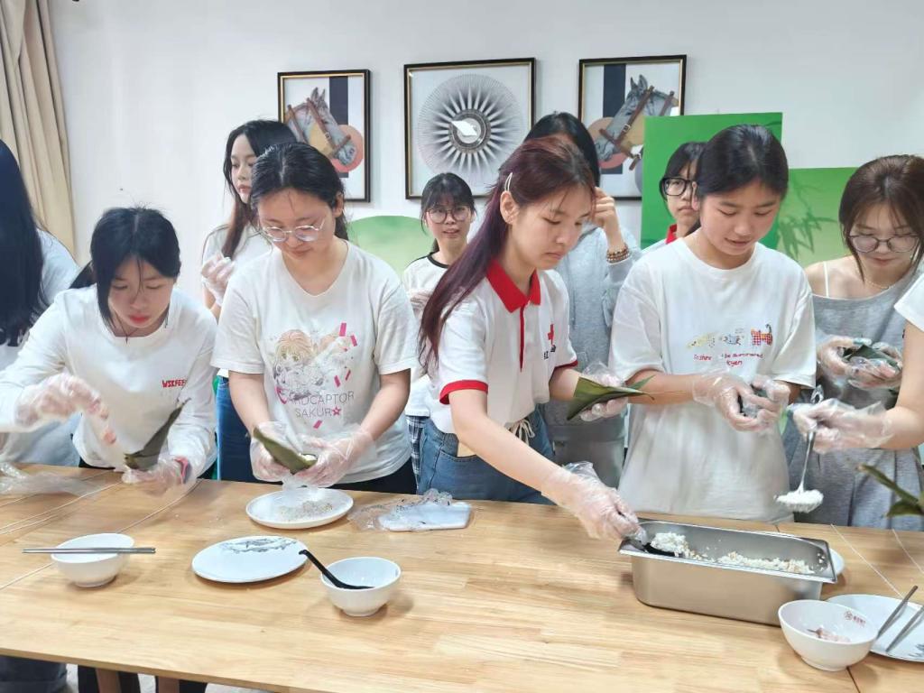 粽叶飘香迎端午,传统文化润心田。5月30日中午,学校两校区同步开展“万水千山‘粽’是情 端午佳节共欢庆”端午节主题活动。食堂当天中午共计发放5000个粽子给师生品尝,学校党委书记叶忠明,党委副书记、校长李丽,党委副书记、纪委书记徐振昌,党委委员、副校长吴志敏,党委委员、副校长张永强与两校区师生共同参与活动,共度端午佳节。参加活动的有各学院学生代表、青马班学员代表、红十字会与义警队代表,还特邀了我校国际教育学院学生一同参与活动,让外国友人通过传统美食制作感受中华传统文化的深厚底蕴。