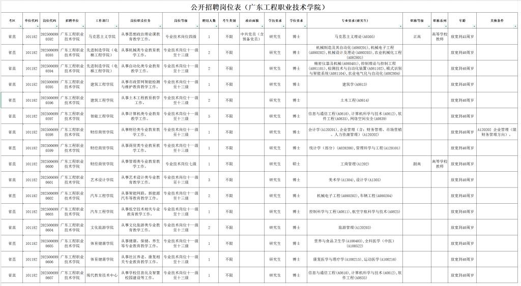现因发展需要,我校参加了由中共广东省委组织部、广东省人力资源和社会保障厅组织开展的广东省事业单位2025年集中公开招聘高层次和急需紧缺人才工作,共公开招聘高层次人才27名,获聘人员为事业单位编制人员,欢迎符合招聘条件的人才报考我校(归属考区:省直,单位代码:101182,岗位代码:2025006990592-2025006990607),岗位具体信息如下: