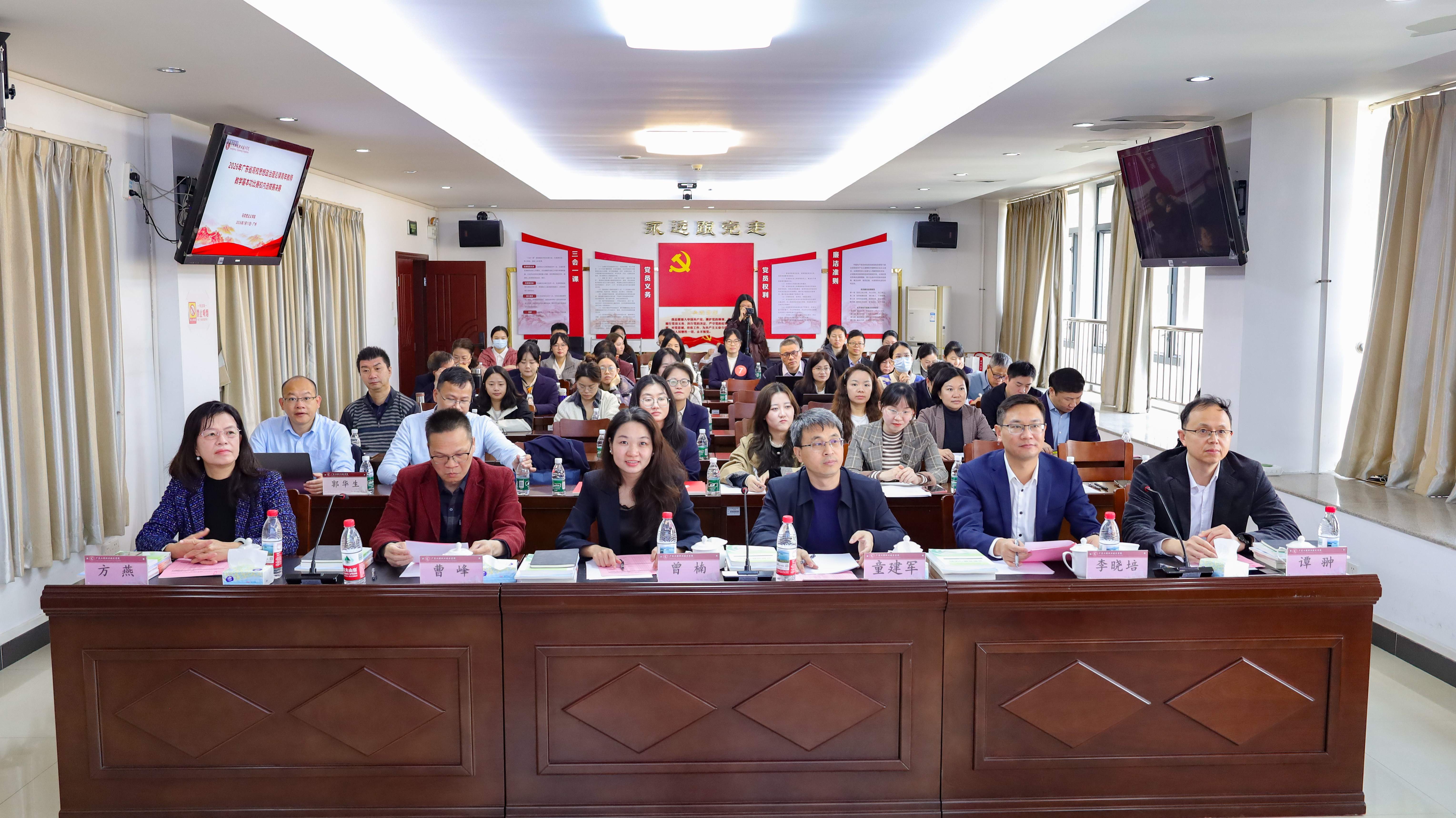 2026年1月17日,我校成功举办2026年度广东高校思想政治理论课青年教师教学基本功比赛校内决赛暨教学能力提升专题培训。本次现场决赛由中山大学马克思主义学院副院长童建军教授、南方医科大学马克思主义学院院长曾楠教授、广东农工商职业技术学院马克思主义学院院长李晓培教授、广东职业技术学院马克思主义学院院长曹峰教授和深圳职业技术大学谭翀教授担任评委。学校副校级领导方燕教授出席开幕式。马克思主义学院党委书记张建德作活动总结,院长郭华生组织专家集体评议,副院长曾名沁主持比赛,我校全体专兼职思政课教师近80人到比赛现场进行观摩。