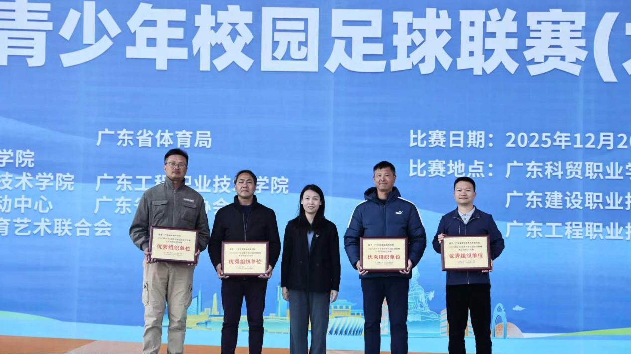 近期,2025年广东省青少年校园足球联赛(大学组)总决赛在清远市成功举办。本次赛事由广东省教育厅与广东省体育局联合主办,广东科贸职业学院承办,广东工程职业技术学院、广东建设职业技术学院、广东省足球运动中心、广东省足球协会、广东省学生体育艺术联合会共同协办。我校作为协办单位之一,圆满完成了赛事各项组织保障工作,受到广东省教育厅和广东省体育局的高度肯定,授予“优秀组织单位”称号。