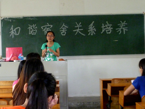 针对西校区以女生为主的宿舍人际关系问题,心理培训师汤朝霞老师在西校区主持"和谐宿舍人际关系培养"的团体心理辅导,活动以宿舍人数为单位进行小组讨论,小组团体合作,增进同学们对宿舍的和谐相处原则的认识。