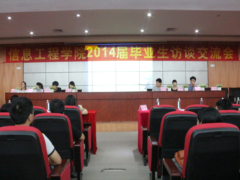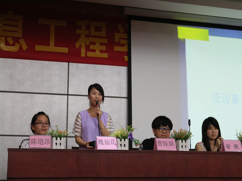 为促进在校生与毕业生之间交流,帮助其合理规划大学生活,提升就业观念,2014年6月13日晚上七点半,信息工程学院2014届毕业生访谈会在图书馆一楼学术报告厅隆重举行。本次访谈会邀请了国家奖学金代表陈垲冰、优秀毕业生代表钟佩伦、优秀学生干部代表谢燕、考上广州美术学院优秀学生代表詹钰琪、优秀实习生代表魏仙花、党员代表曾春露等人作为访谈嘉宾,信息工程学院刘松梅书记、肖贵灯副书记、李碧方老师、刘娟老师、叶晓明老师及我院12、13级学生出席了本次访谈会。