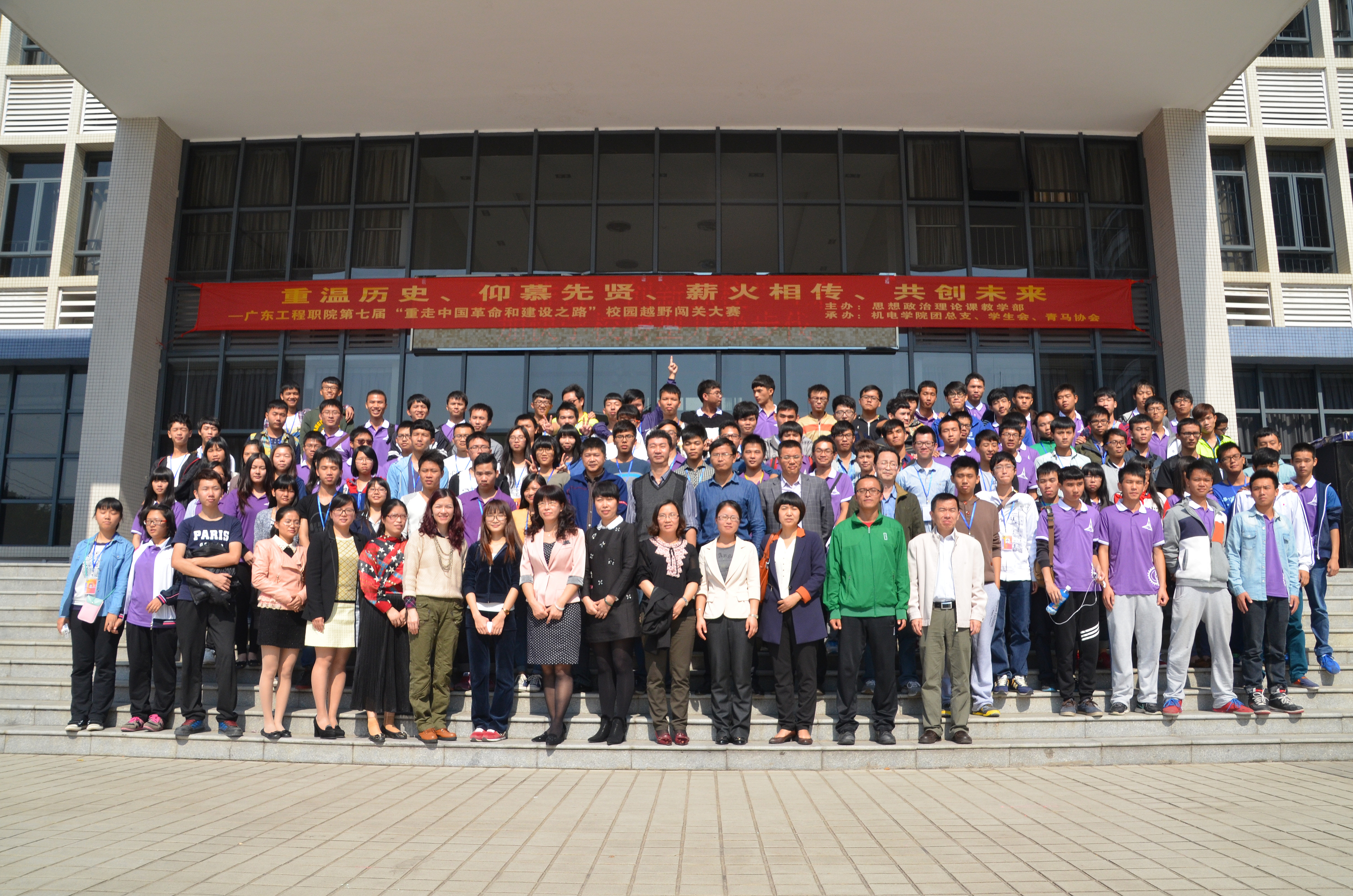 为深入学习党的十八届三中、四中全会精神,全面贯彻"以‘立德树人'为根本任务"的教育方针,增强我院学生对中国特色社会主义的道路自信、理论自信和制度自信,激发他们为实现国富民强的伟大"中国梦"而努力学习。2014年11月22日(星期六)上午,由思想政治理论课教学部主办,机电工程系团总支协办的第七届"重走中国革命和建设之路"校园越野闯关知识竞赛活动在学院隆重举行。本次活动的主题是"重温历史、仰慕先贤、薪火相传、共创未来 "。来自学院各级学生共74支参赛队600多名学生参加了此次竞赛活动。