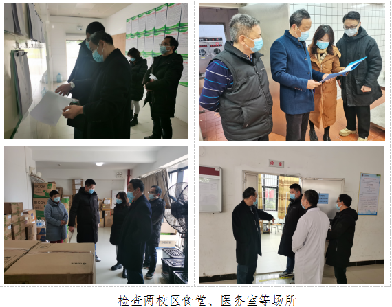 徐振昌一行实地检查了两校区食堂、医务室、医学观察隔离区、防疫物资存放处等场所,与工作人员进行广泛交流,仔细询问他们在工作中存在的困难,结合上级有关部门防疫检查发现的问题,重点监督整改落实情况,并对食品安全、消防安全、诺如病毒防控等提出改进建议。