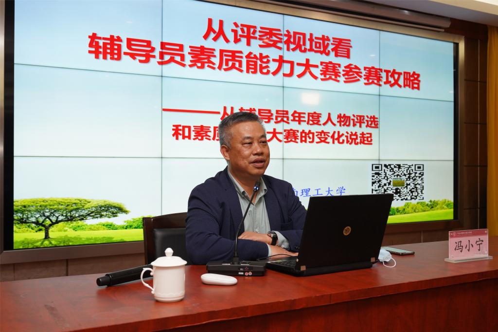 广州科技职业技术大学党委书记、华南理工大学硕士研究生导师、教育部高校辅导员培训和研修基地兼职教授、辅导员专项实践博导冯小宁作题为《从评委视域看辅导员素质能力大赛参赛攻略——从辅导员年度人物评选和素质能力大赛的变化说起》的专题培训,冯小宁以辅导员年度人物评选趋势和辅导员素质能力大赛变化为切入点,从全国辅导员素质能力大赛方式的改变看辅导员队伍建设趋势,对案例分析、谈心谈话等环节作了重点分析。他强调,工作是检验比赛成果的舞台,比赛是检验日常工作的舞台,作为辅导员责任重大,要主动学习,勤于思考,善于总结,不断提升职业素质能力。
