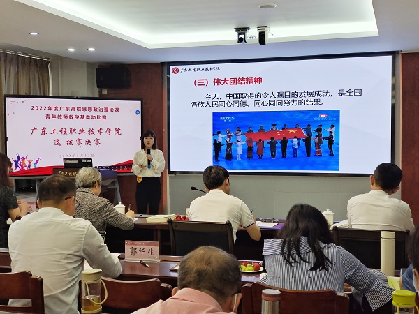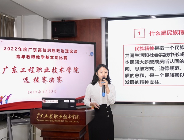 2022年5月13日,我校在广州校区办公楼511室举办了2022年度广东高校思想政治理论课青年教师教学基本功比赛校内选拔赛决赛,学校党委副书记方燕教授、广州番禺职业技术学院曹群教授、顺德职业技术学院董同彬教授、广东农工商职业技术学院李晓培教授、广东机电职业技术学院林国强教授担任了比赛的评委,我校马克思主义学院院长郭华生在开幕上致辞,并主持了决赛。我校及其他兄弟院校专兼思政课教师近50人现场观摩了比赛。