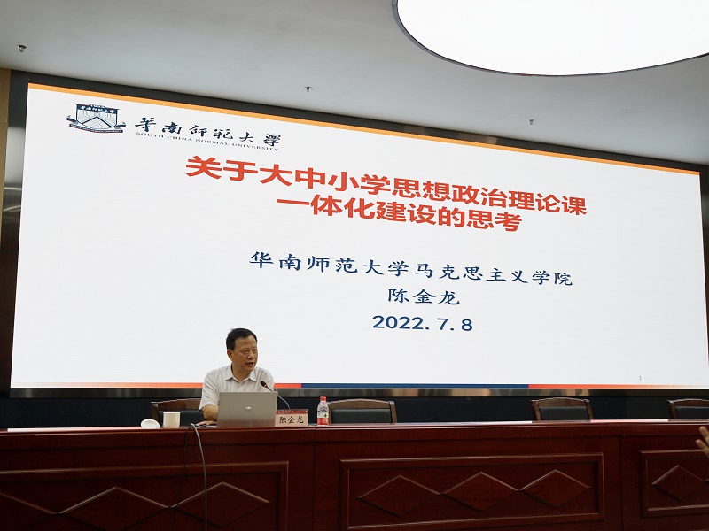 在专题研讨环节,一体化建设专家指导组组长华南师范大学陈金龙教授做了题为《关于大中小学思想政治理论课一体化建设的思考》主旨报告,他认为:“推进大中小学思政课一体化建设要遵循学生认知、成长规律,教育教学规律和回应时代发展与社会进步的必然要求;要把整体设计教学目标、统筹优化教学内容、科学规划教材建设、合理统筹教学评价、建齐配强教师队伍、立体推进交流互动作为推进大中小学思政课一体化建设重点。”