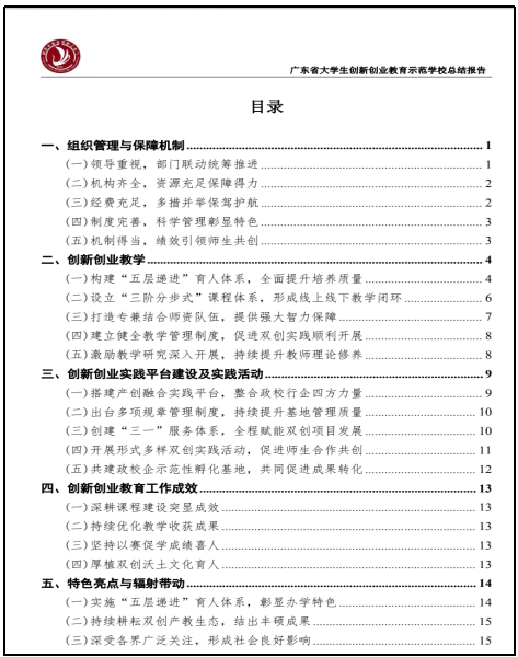 我校自2015年获评首批广东省大学生创新创业教育示范学校以来,不断深化创新创业教育改革,将创新创业教育融入人才培养全过程,构建了“教学-实践-竞赛-实战-孵化”五层次递进的职业能力与创新能力融合培养体系,形成了特色鲜明的“五递进”产创培育模式,推动多种形式的创新创业产教融合新生态,充分发挥示范校的辐射带动作用。