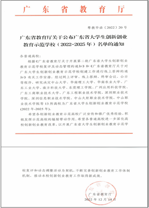根据《广东省教育厅关于公布广东省大学生创新创业教育示范学校(2022-2025年)名单的通知》(粤教毕函〔2022〕20号),我校顺利通过省双创示范校第二轮复评,继2015年和2018年后,第三次获评“广东省大学生创新创业教育示范学校”荣誉称号。