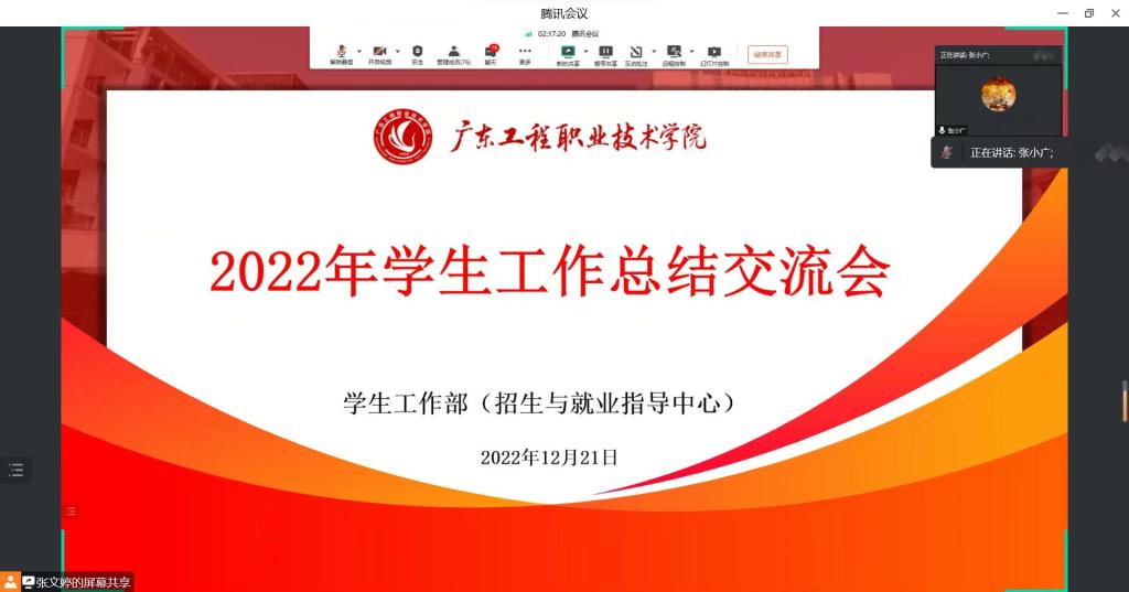 12月21日上午,学生工作部(招生与就业指导中心)召开2022年学生工作总结交流会,学校副校长张小广出席会议并讲话,学生工作部(招生与就业指导中心)全体人员、各二级学院党总支副书记及全体辅导员参会,学生工作部部长黄馥丽主持会议。