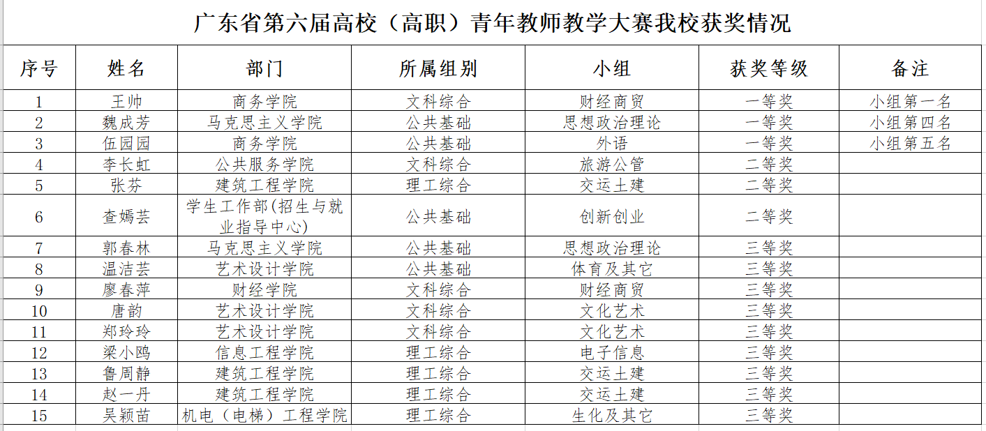 成绩的取得实属不易,特别是青教赛第二阶段现场决赛阶段,分说课和教学绝活展示两项。因受疫情影响,现场决赛采用“选手线上限时上传,评委线下集中评选”的方式,通过“广东省第六届高校(高职)青年教师教学大赛”5G+智慧教育综合平台,对参赛选手提交的作品进行评选。面对病毒的困扰、克服教学资源有限和时间紧等问题, 6位老师限时录制、工会、教务部的工作人员限时审核提交,最终圆满的完成了现场决赛,收获了3个一等奖和3个二等奖的历史最好成绩,王帅老师还以小组第一名的成绩晋级青教赛的总决赛。