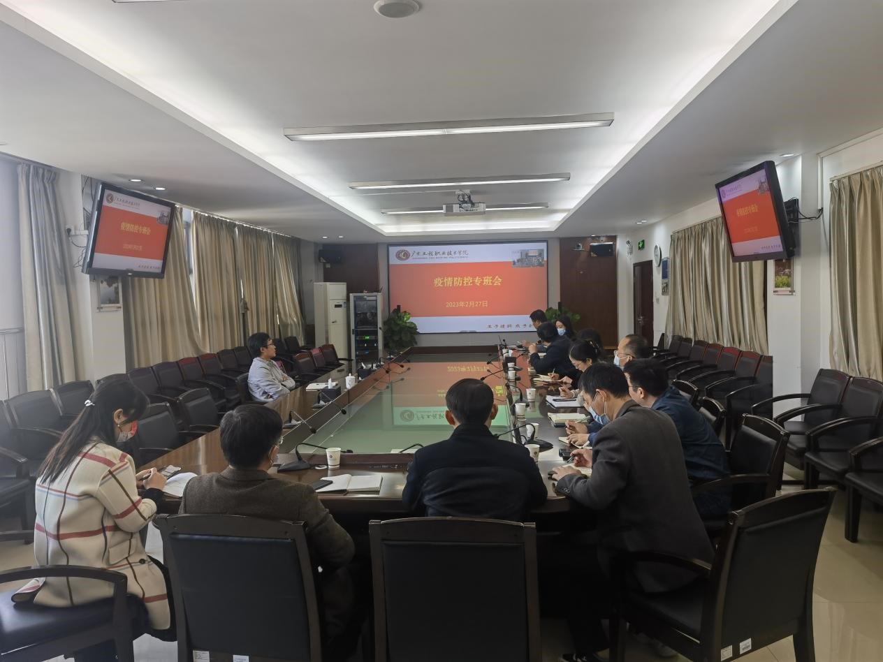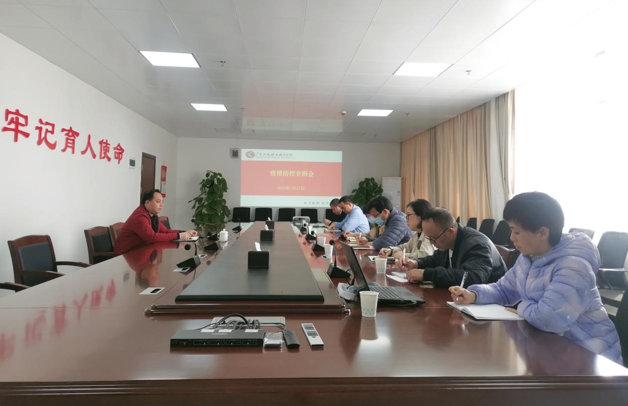 2023年2月27日上午,学校在广州校区办公室615室和省职教城校区办公楼411室召开防控专班工作会,研究部署近期学校疫情防控工作。学校副校长揭英荣、张小广,防控专班成员单位负责人、各二级学院党总支副书记参加会议。会议由揭英荣主持。