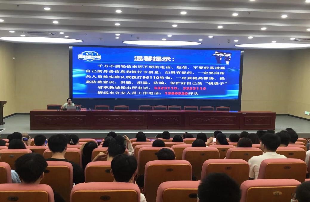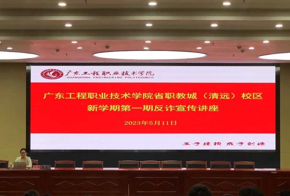 5月11日,学校在省职教城(清远)校区办公楼一楼报告厅开展2023学年第一期反诈宣传讲座;到场人员有各行政部门老师、二级学院书记和副书记、辅导员、在清远校区没课的老师、物业安保、宿管员、部分学生等。反诈讲座由总务后勤部(安保处)组织和主持,清远市反诈中心谢越老师主讲。