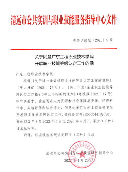 经资料评审、实地评估和综合评定,清远市人力资源和社会保障局同意广东工程职业技术学院等4所院校为清远市院校职业技能等级认定机构,可面向本校在校学生开展职业技能等级认定;同意我校增加认定20个工种范围。
