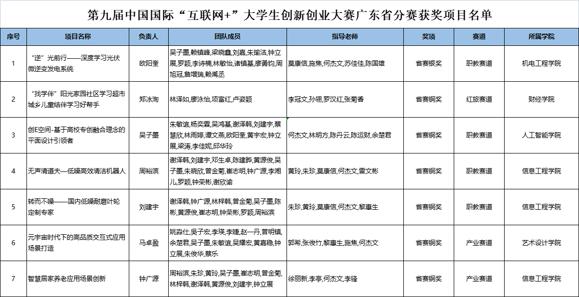 我校组织的各参赛项目在近期结束的各类省级以上大学生创新创业大赛中,经过认真备赛和努力拼搏,获得了较好的比赛成绩。其中在第九届中国国际“互联网+”大学生创新创业大赛广东省分赛中荣获银奖1项,铜奖6项,并获学校集体奖;在2022-2023年度广东省职业院校学生专业技能大赛(创新创业)赛项中荣获二等奖1项。在第十三届全国大学生电子商务“创新、创意及创业”挑战赛广东赛区选拔赛中荣获二等奖3项,三等奖2项,并获优秀组织奖;在广东第四届女大学生创新创业邀请赛中荣获银奖1项,铜奖2项,优胜奖2项,并获优秀组织奖。