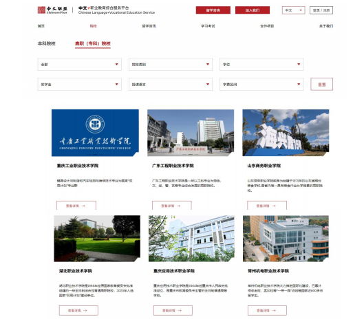 12月7日,全球中文联盟大会作为世界中文大会的系列活动之一在京举行。会议宣布正式启动“中文+职业教育综合服务平台”,该平台由教育部中外语言交流合作中心指导建设,聚焦高等教育院校和中资企业“走出去”,是一个集中外教育交流合作、学生来华留学等容一体化的“中文+职业教育”综合服务展示平台。首批入驻平台的院校共有52所,其中本科院校26所、高职院校院校26所。通过积极申请,学校获批成为首批入驻“中文+职业教育综合服务平台”的院校之一。