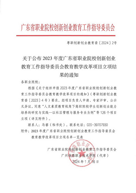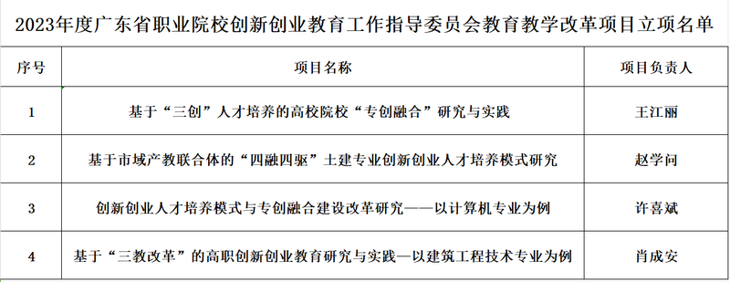 近日,广东省职业院校创新创业教育工作指导委员会公布了2023年广东省职业院校创新创业教育工作指导委员会教育教学改革项目立项结果的通知,由我校创新创业学院组织申报,王江丽老师主持的《基于“三创”人才培养的高校院校“专创融合”研究与实践》赵学问老师主持的《基于市域产教联合体的“四融四驱”土建专业创新创业人才培养模式研究》、许喜斌老师主持的《创新创业人才培养模式与专创融合建设改革研究——以计算机专业为例》和肖成安老师主持的《基于“三教改革”的高职创新创业教育研究与实践—以建筑工程技术专业为例》等4项研究项目被确定为2023年广东省职业院校创新创业教育工作指导委员会教育教学改革立项项目。