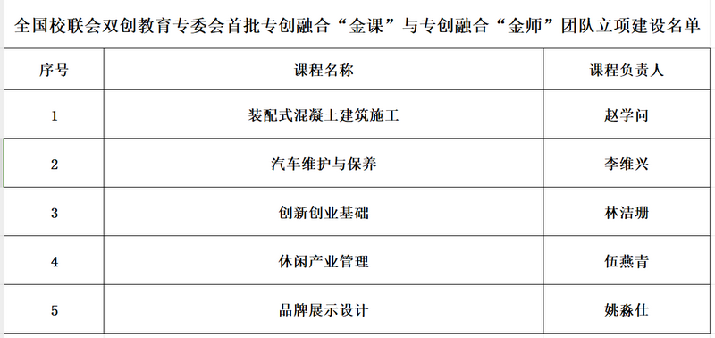 近日,全国高等职业学校校长联席会议双创教育专委会公布了首批专创融合“金课”与专创融合“金师”团队立项建设名单,根据全国高等职业学校校长联席会议双创教育专委会《关于遴选建设高等职业学校专创融合“金课”与专创融合“金师”团队的通知》有关要求,经评审遴选,我校推荐申报的《装配式混凝土建筑施工》等5门课程被确定为全国高等职业学校校长联席会议双创教育专委会首批专创融合“金课”与专创融合“金师”团队项目立项建设。