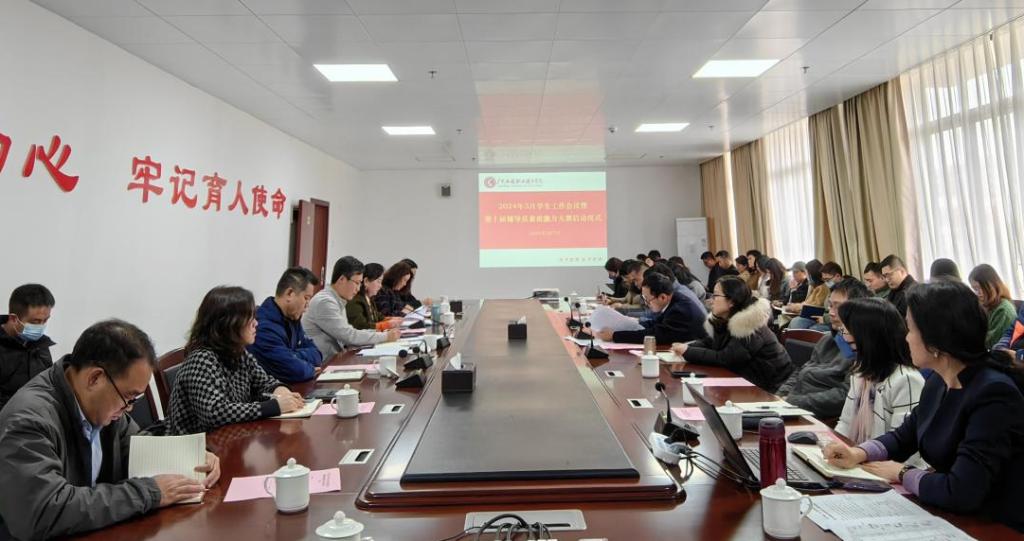 张小广副校长充分肯定了过去一年学生工作取得的各项成绩,他指出,一年来学工线的同志们踏踏实实、兢兢业业,开展了大量创新性工作,取得了不俗的成绩,特别是在学生教育管理保稳定、心理健康保安全、招生和就业两旺、实现辅导员队伍发展保障等方面,谱写了育人工作的“奋进之笔”。他强调,2024年要坚持在学生教育与管理、就业工作、招生工作、辅导员队伍建设、内涵建设、奖助贷工作等方面持续发力,用心谋事、潜心干事、担当实干,并提出三点工作要求:一是强化责任意识。切实筑牢意识形态阵地,牢牢树立强烈的责任意识,充分认识值班值守工作的重要性,进一步增强使命感、责任感,做到守土有责、守土尽责,不断推动学生工作向纵深发展;二是强化规矩意识。学工队伍在工作中要讲规矩,严格遵守各项工作纪律要求,把握学生成长规律,进一步强化责任担当,提升辅导员队伍的职业化、专业化水平,树立学院学工队伍的良好形象,在以学生为中心基础上创新工作方式和方法;三是强化安全意识。坚决杜绝安全责任事故,严守学生安全底线,增强忧患意识、坚持底线思维,以“时时放心不下”的责任感抓实抓牢学生安全工作,精准把握学生思想动态、实际情况和心理状况,在学生思想教育、心理健康工作取得实效,确保学生身心健康,切实守护学生安全,保障学生身心全面和谐发展。