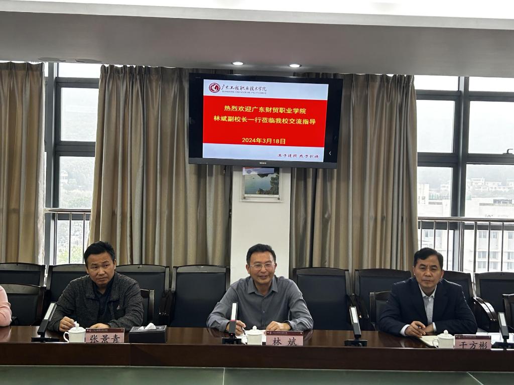 3月18日上午,广东财贸职业学院林斌副校长一行到我校开展调研交流,座谈会在广州校区 615 会议室召开。学校揭英荣副校长出席交流会,资产设备部部长朱靖、总务后勤部(保卫部)负责人廖彦云等参加座谈会。座谈会由揭英荣主持