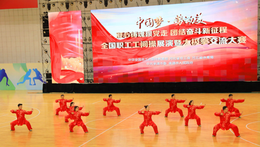 为打造健康文明、昂扬向上、全员参与的职工文化,6月4-6日,由全国总工会宣传教育部、河北省总工会、河北省体育局、承德市委市政府联合举办的“中国梦·劳动美——凝心铸魂跟党走 团结奋斗新征程”全国职工工间操展演暨太极拳交流大赛在河北省承德市奥体中心举行,此次交流赛共有来自各省(区、市)、各全国产业工会、中央和国家机关工会联合会的36支代表队600余名职工参赛。