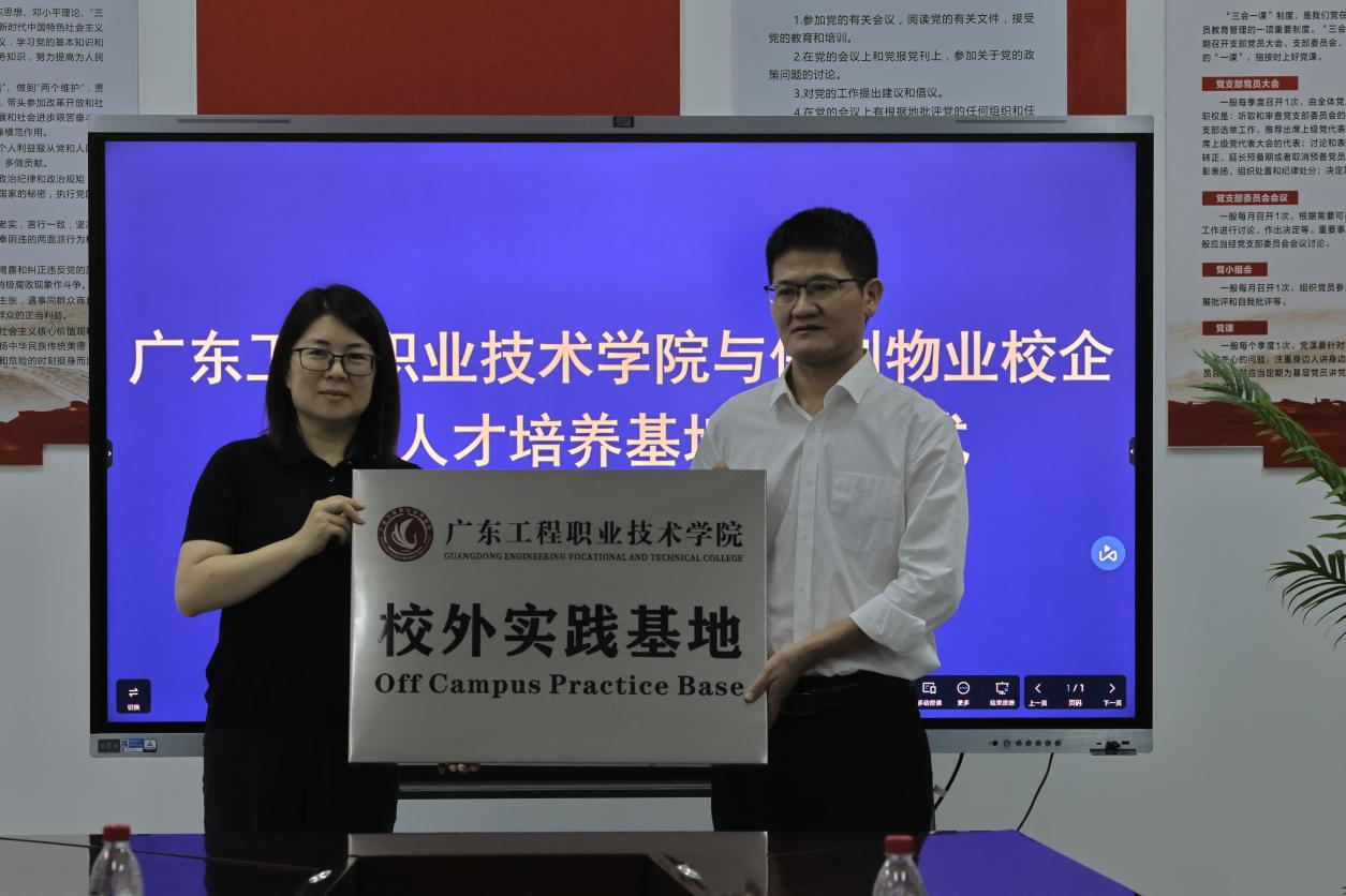 校企双方还郑重举行授牌和挂牌仪式。吴志敏副校长先代表学校向企业代表徐钒总监授予“广东工程职业技术学院校外实践基地”牌匾。随后,校企双方共同为“保利物业人才培养基地”揭幕。仪式结束后,企业方在教学1号楼举行了“保利物业2025届订单班”宣讲会,现代物业管理专业2025届学生参加宣讲会。