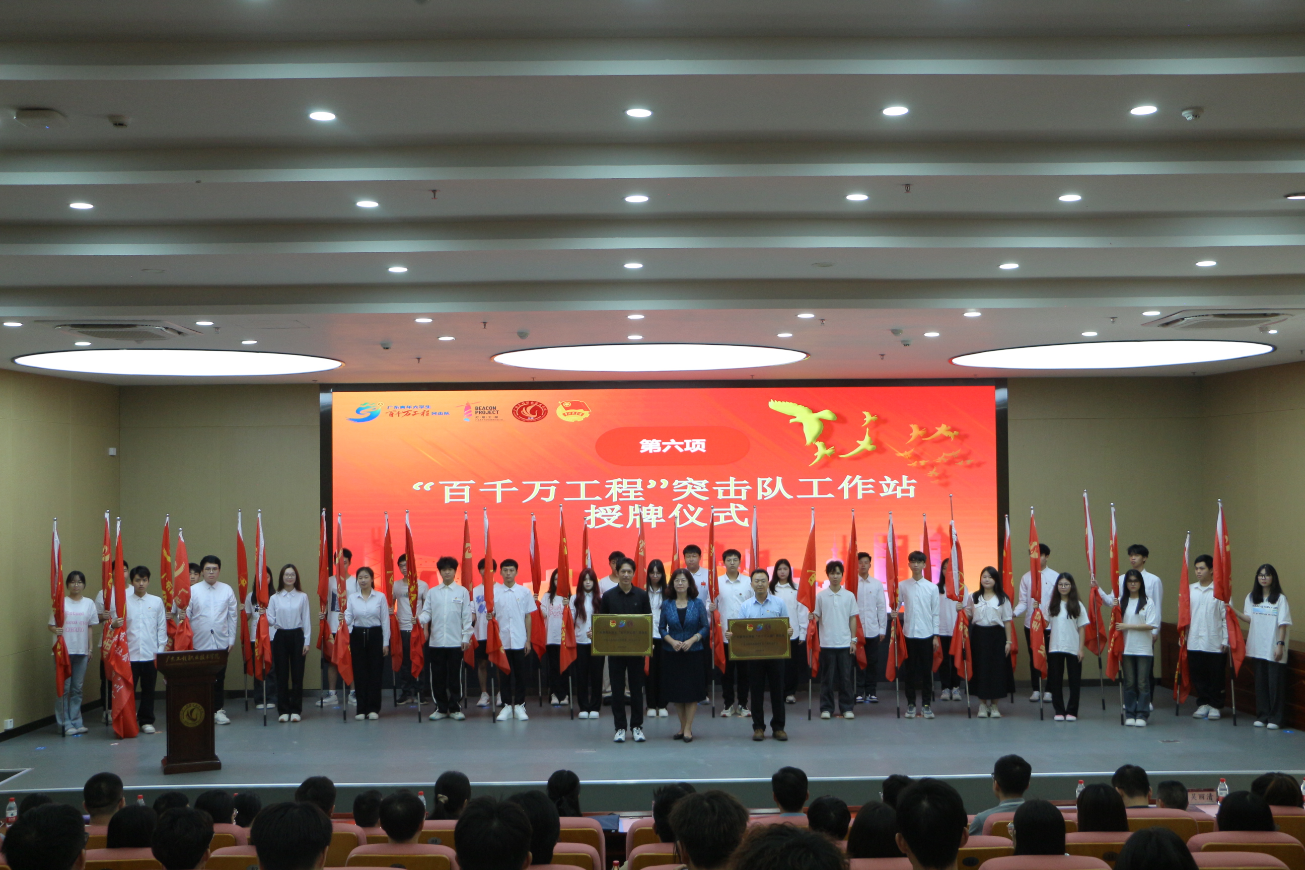 截至目前,学校共有117支队伍注册为“百千万工程”突击队,34支突击队成功结对,并且成功申报了1支团中央“七彩假期”实践队。实践服务内容涵盖产业发展(直播带货)、基层治理、文旅振兴、村容村貌设计美化、智能无人机助农应用、AI技术测算、赛会志愿服务等方面。突击队主要奔赴潮州、梅州、清远、阳江、河源、陆丰等地开展服务工作。仪式现场分别为 “百千万工程”突击队及工作站授进行授旗、授牌。授旗仪式代表着责任的传承、精神的传递,各支队伍、各位青年重任在肩,在火热的“百千万工程”突击队中,担当起青年时代使命。