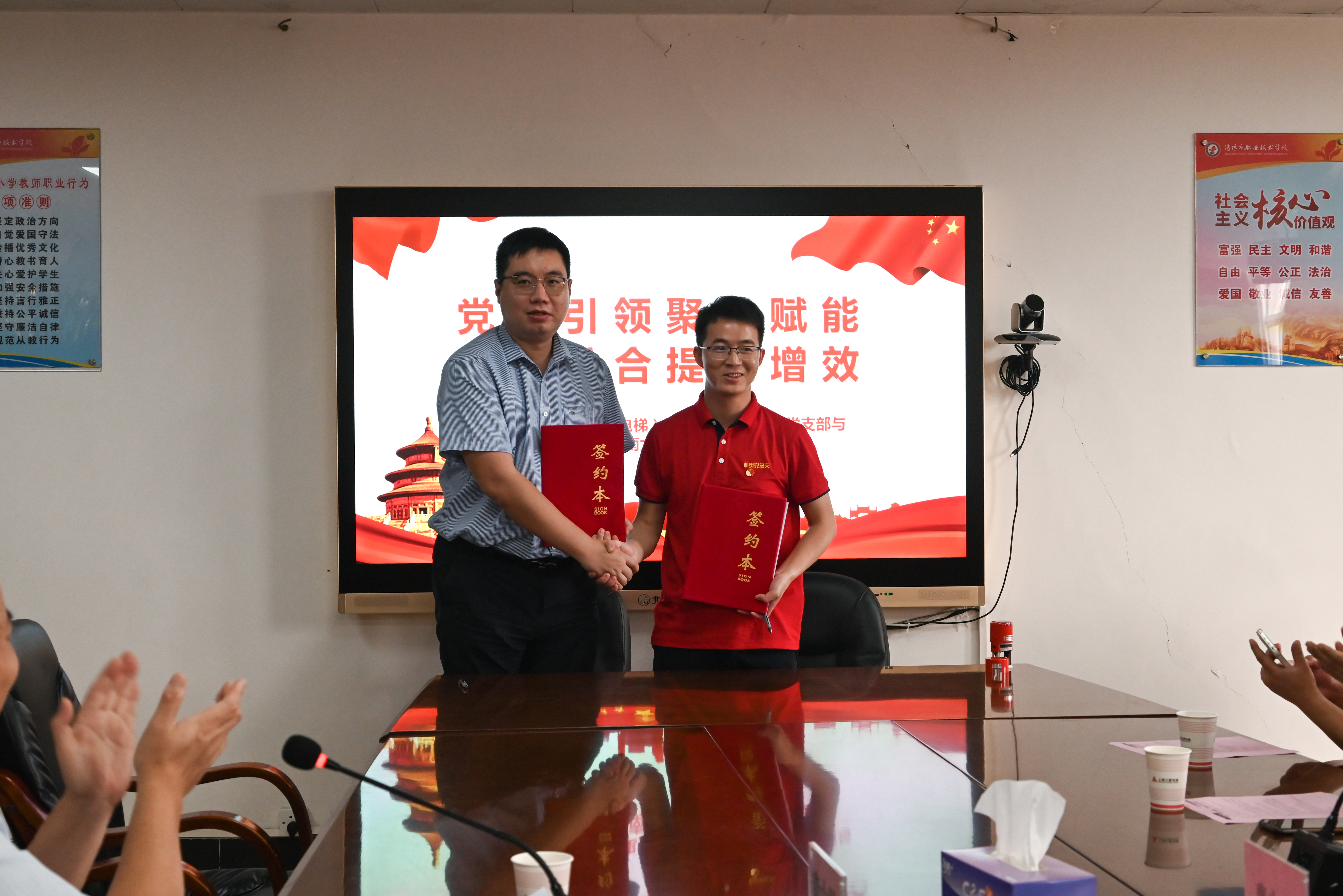 会后,机电(电梯)工程学院教师第一党支部与上海三菱电梯华南大区党支部共建签约。