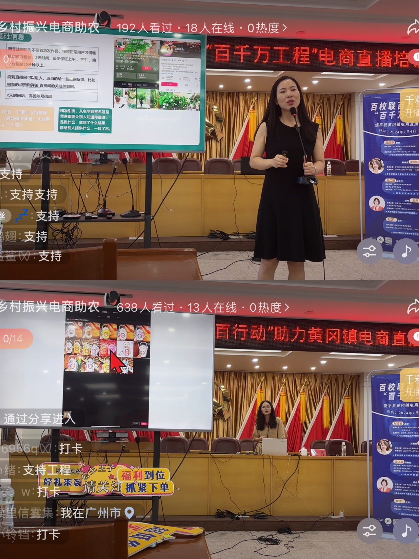 7月4日-5日,调研队伍在饶平县黄冈镇开展电商直播培训。商务学院院长刘迎春教授、专业主任李丽红副教授、骨干教师王江丽副教授、王帅老师、杜芳老师和“为农弘商”百千万突击队优秀学生助理组成师生教学团队,依据黄冈镇党委的需求,面向黄冈镇乡村青年、新农人、致富带头人及乡镇社工等进行培训。培训班由黄冈镇镇委书记沈吉蕊书记主持,并作开班致辞。本次培训内容涵盖市场分析、数字技术、起号养号、脚本话术、拍摄剪辑等,以生动的案例分享、实战演练和互动交流等方式,让学员深入了解直播营销的基本技能和核心要素,共计5场专题讲座,现场培训54人,共计培训270人次,并开启即时直播,直播在线共1700余人次。