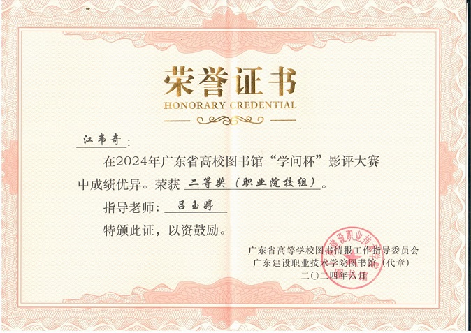 为推进影评大赛的开展,图书馆积极宣传,发动和组织学生参赛,收到学生有效投稿作品34篇。经过作品查重和图书馆初评小组评审,选出5篇优秀作品参加全省终评。在全省终评中,我校人工智能学院江韦奇同学的作品“传统诗词文化下《长安三万里》的电影美术场景建构”荣获职业院校组二等奖。