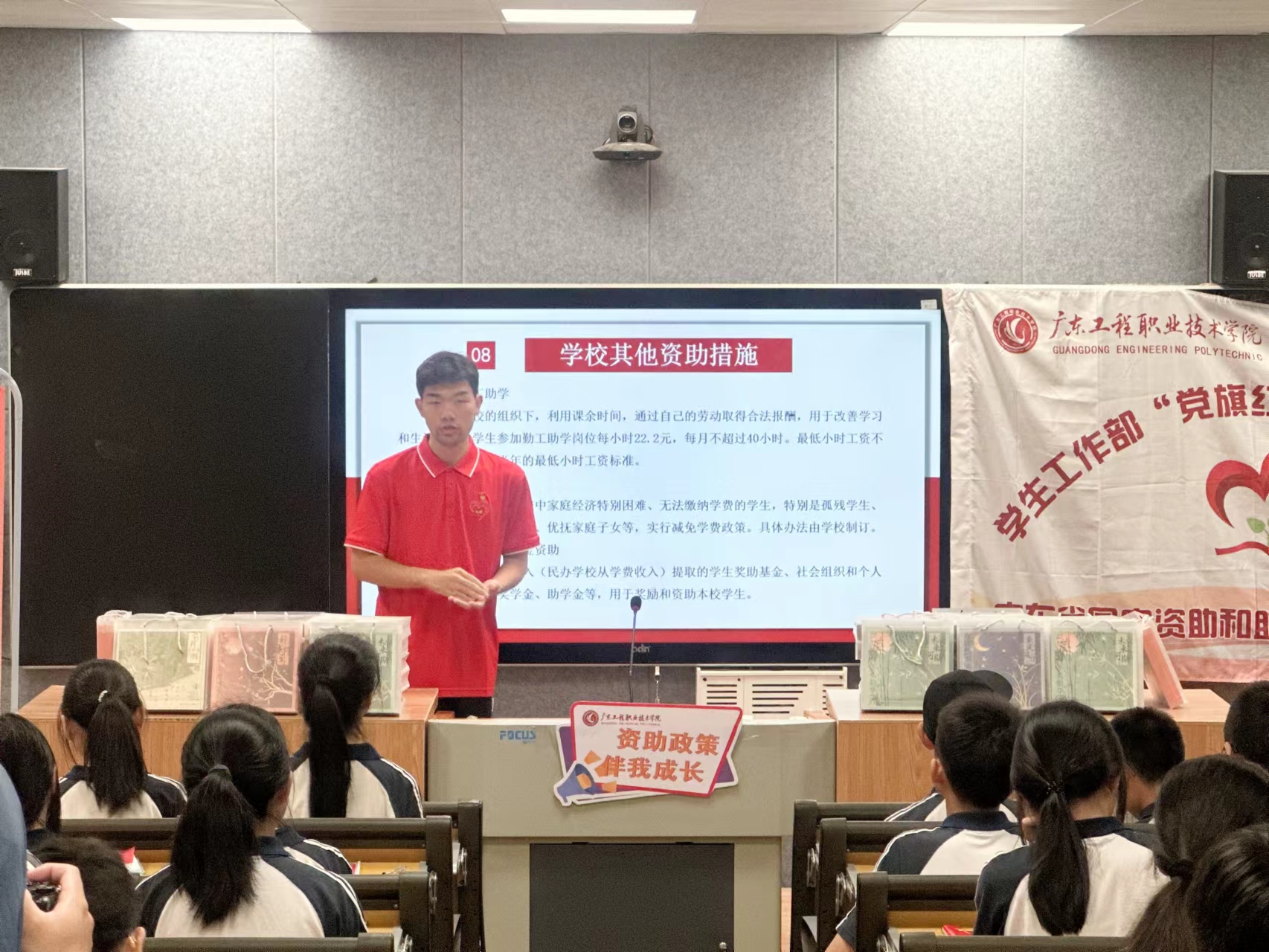 我校“党旗红”圆梦振兴宣讲队深入当地学校,举办主题为“梦想点亮芳华 资助伴我成长”资助政策宣讲会,为当地学生详细解读了国家资助及助学贷款政策以及学校特色资助项目,为家庭经济困难学生缓解升学压力,助力每一个大学梦想。