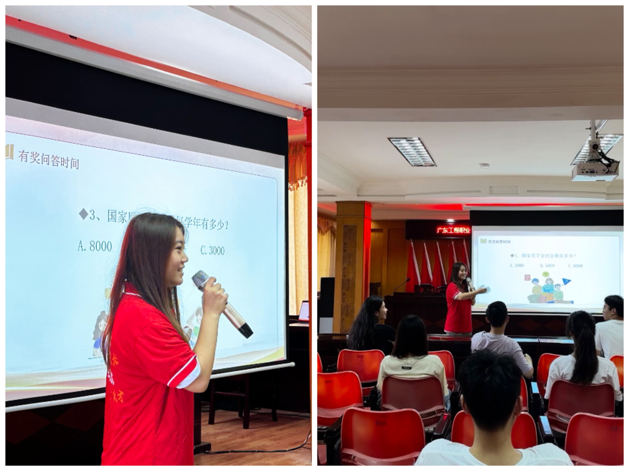 在指导老师黄真真、龚雪雪的带领下,宣讲队联合当地镇政府,组织宣讲国家资助政策和助学贷款政策,充分发挥当地学校在宣传国家资助政策中的组织作用,让国家资助政策惠及每一位家庭经济困难学生。在宣讲会上,国家励志奖学金获得者、“校园十大自强之星”提名奖获得者等宣讲队成员向同学们详细介绍了国家资助项目和国家助学贷款的申请条件、申请流程等,发放了国家资助宣传手册和生源地助学贷款申请指南等宣传资料,以及《广东省国家助学贷款问卷调查》,并通过有奖竞答的方式与同学们充分互动,让学生资助政策更加深入人心。