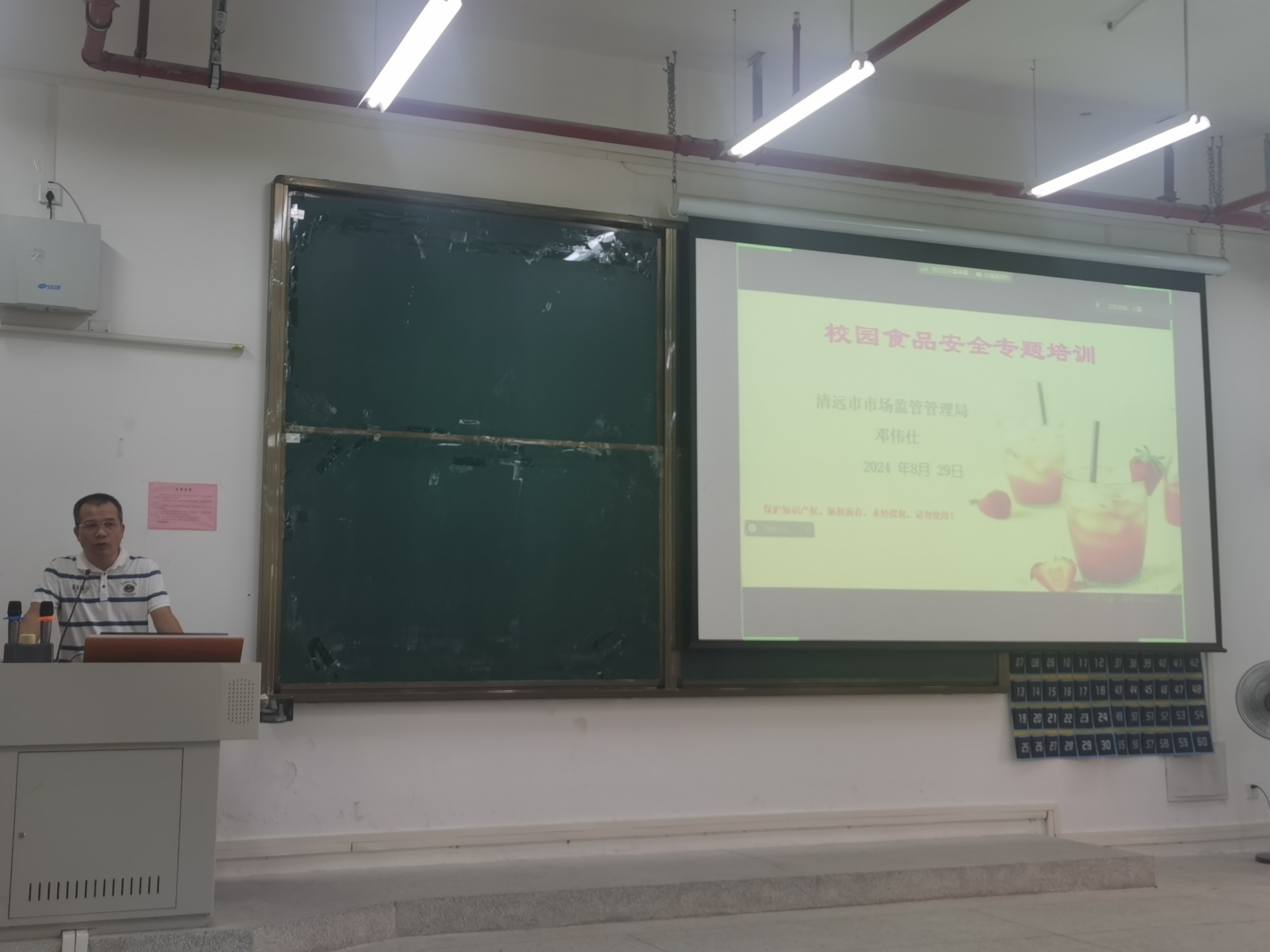本次培训活动邀请到了多位属地管理部门专家领导莅临指导,保障了培训的专业性、权威性。培训活动的第一项由清远市市场监督管理局食品餐饮监督管理科科长邓伟仕开展校园食品安全专题培训讲座。主要包括食品安全法律法规概述,学校饭堂常见食品安全问题及防范措施,食品原料采购、储存、加工、销售各环节的卫生要求,应急处置流程与案例分析等。
