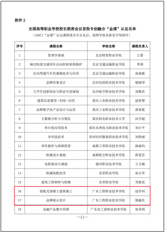 近日,全国高等职业学校校长联席会议公布了首批专创融合“金课”与专创融合“金师”团队评审结果。按照“重在建设、严把质量、示范效应”的原则从全国370门立项课程中评选出175门专创融合“金课”准予结项,并择优认定100门课程为全国高全国高职校长联席会首批专创融合“金课”。我校此前获立项建设的5门专创融合“金课”全部通过结项,其中赵学问老师主持的《装配式混凝土建筑施工》和姚淼仕老师主持的《品牌展示设计》等2门课程获认定为全国高职校长联席会首批专创融合“金课”。